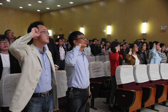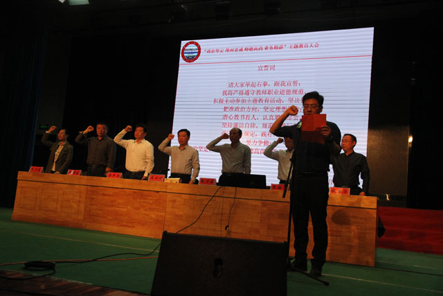 会上,高云海副局长首先介绍了淮安区教育发展概况,同时提出了关于高中教学的建议和要求。他重点强调了主题教育活动中对所有教师划设的“五条红线”和六个“一律”,要求所有人员严肃对待,自查自纠,务必做到政治坚定、绝对忠诚、师德高尚和业务精湛。随后,楚州中学工会主席咸春华宣读区纪委、监察委通报的教师违规人员及处理决定,以案示警。紧接着,与会人员全体起立宣誓,表示坚决做到:把准政治方向,坚定理想信念;潜心教书育人,认真履职尽责;坚持廉洁自律,规范从教行为;严守信访规定,践行师德师风。努力争做“政治坚定、绝对忠诚、师德高尚、业务精湛”的楚中教育人。
