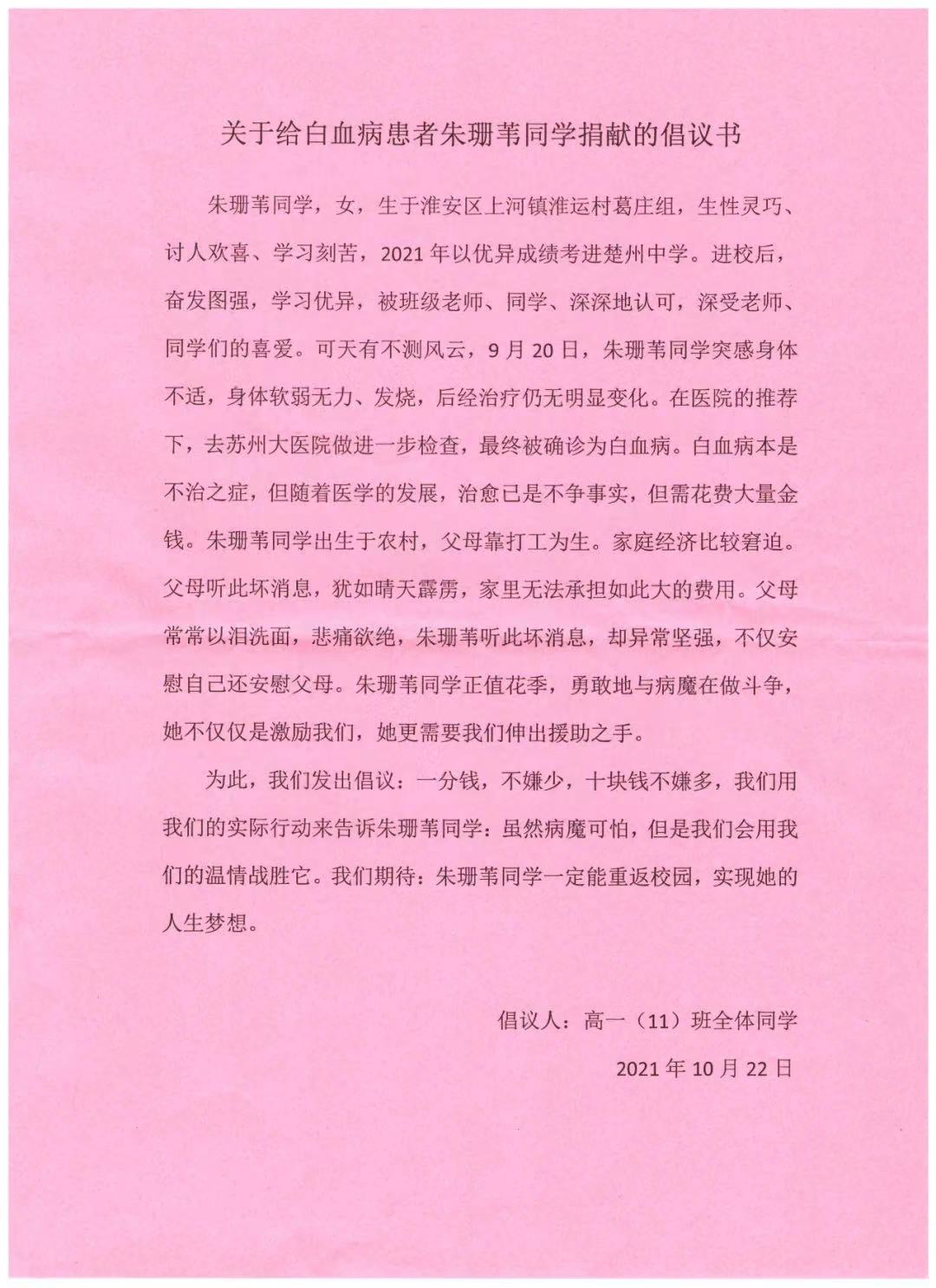 学党史见行动 爱心捐款暖校园|楚州中学师生为患病学生捐款献爱心
