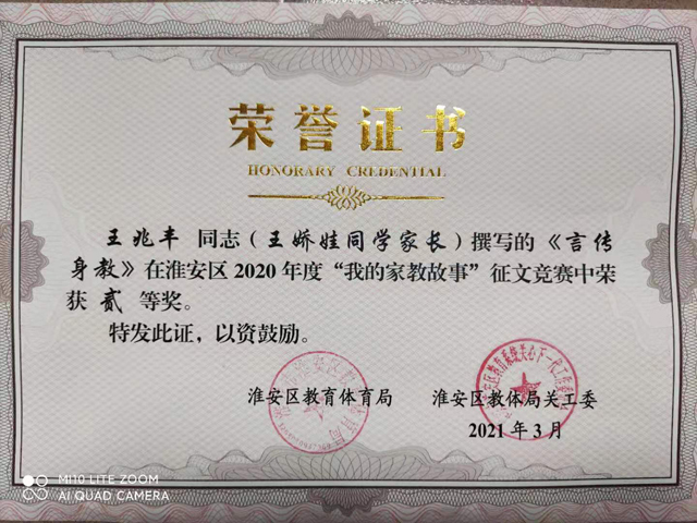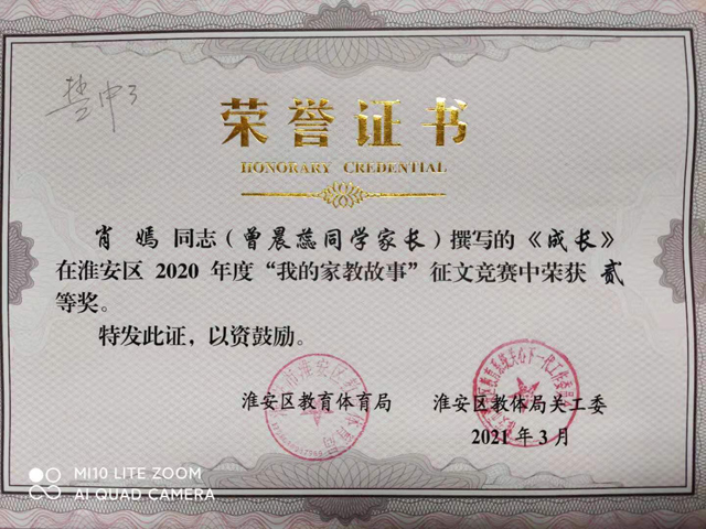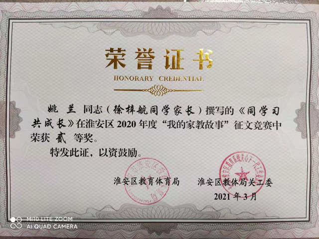 从日前召开的淮安区教育体育系统关工委工作会议上传来消息,楚州中学在区2020年度“我的家教故事”征文竞赛中,高一(2)班曾晨蕊同学家长肖嫣撰写的《成长》、高一(14)班徐梓航同学家长姚兰撰写的《同学习 共成长》、高二(2)班王娇娃同学家长王兆丰撰写的《言传身教》三篇征文作品分别荣获二等奖,受到了区教体局、区教体系统关工委的表彰,这也是全区唯一一所高中学校获得此项奖励。