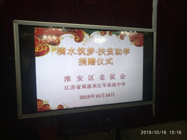 10月17日是全国第六个扶贫日。16日下午,我校在南校区致远楼三楼会议室举行江苏省滴水筑梦第二轮第三期扶贫助学金发放仪式。淮安区老区开发促进会、扶贫开发协会领导徐学春、毛云飞、戴晶晶,我校副校长赵立同、30名高三年级受助学生及教师代表出席了仪式,受助学生接受了每人2000元的助学捐赠。