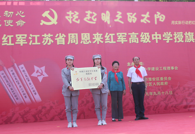 在共和国成立70周年纪念日到来之际,9月18日上午,以开国总理周恩来名字命名的全国首所红军高级中学——中国工农红军江苏省周恩来红军高级中学授旗授牌仪式在我校举行。