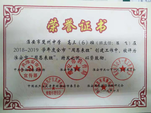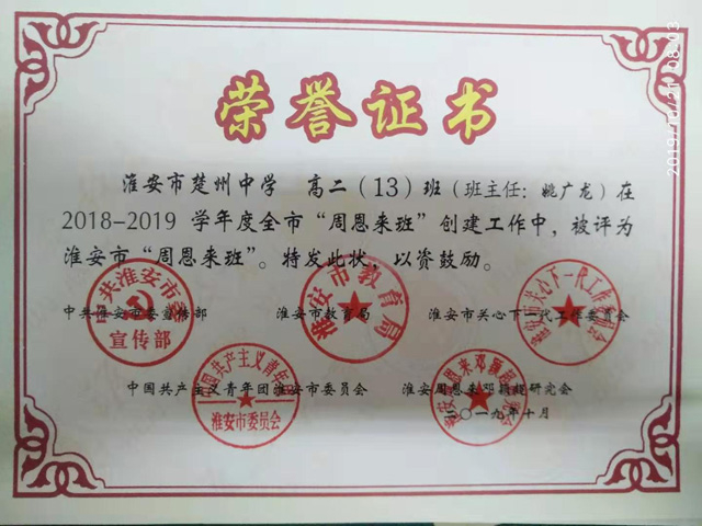 近年来,我校充分挖掘“恩来精神”这一优势资源,积极参与、扎实开展“周恩来班”创建的各项活动;通过引导学生深入学习、践行“恩来精神”,自觉接受深刻的爱国主义、集体主义和革命传统教育,自觉树立“为中华之崛起而读书”的远大志向;同时,通过多种途径表彰、宣传“周恩来班”评选活动中涌现出来的班级典型,营造积极向上、有楚中特色的班风、校风和“人人学恩来,个个做表率”的浓厚氛围。“周恩来班”像一颗颗红色的种子,在我校生根、开花、结果,一批批市、区、校级“周恩来班”相继诞生。在2018-2019学年度全市“周恩来班”创建工作中,我校姚广龙老师担任班主任的原高二(13)班、陈飞老师担任班主任的原高三(6)班由于表现突出,被命名为淮安市“周恩来班”,受到了中共淮安市委宣传部、市教育局、市关工委、团市委和淮安周恩来邓颖超研究会五个部门的联合表彰。