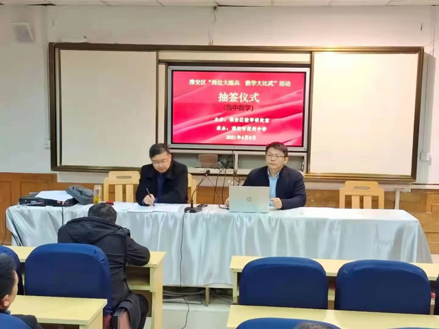 为大力推进高效课堂建设,践行“融学课堂”核心理念,促进教师教学素养的全面提高,达成“以比促学,以比带训,以比择优”的活动目的,4月12至13日,淮安区高中数学学科“岗位大练兵,教学大比武”决赛在我校举行。来自淮安区六所普通高中的29名教师参加了此次决赛,我校有5名老师参赛,活动由区数学教研员徐云翔老师组织。