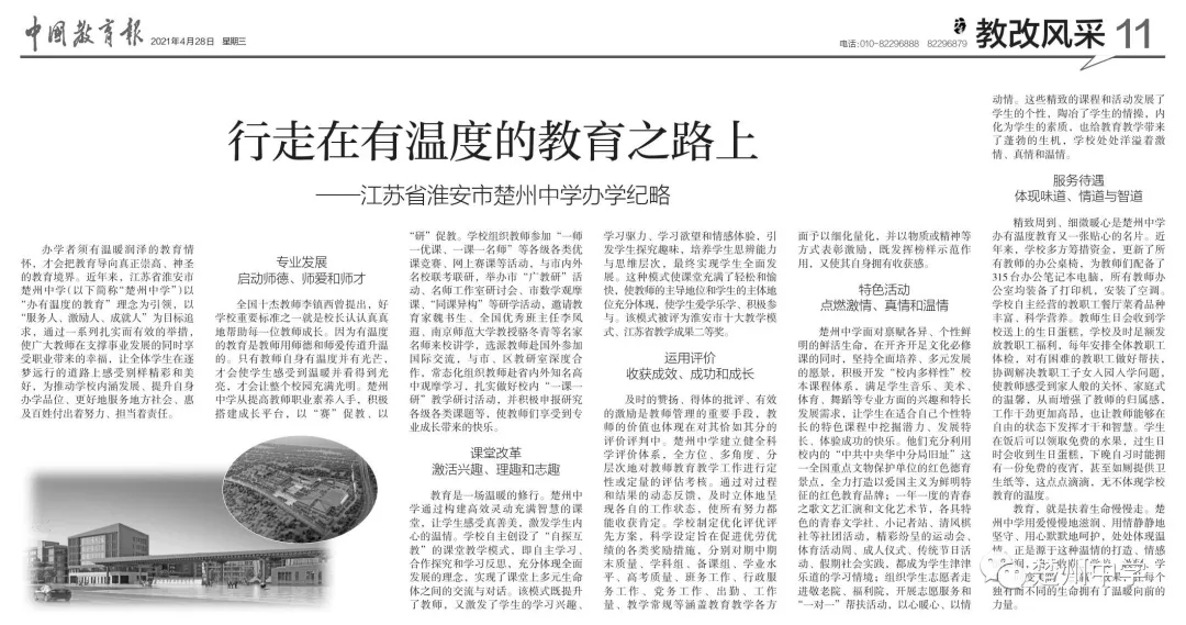 点赞有温度的教育|《中国教育报》推介楚州中学办学特色