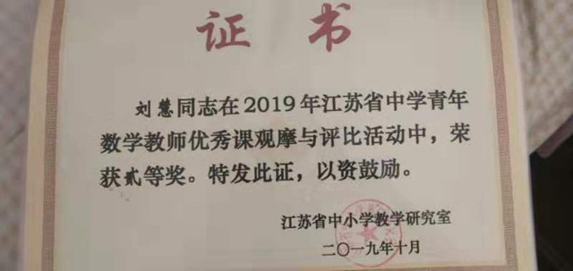 在此之前举行的淮安市高中青年数学教师优课竞赛活动中,刘慧老师荣获一等奖。据悉,我校已有多名教师在省优课大赛中获得一、二等奖。