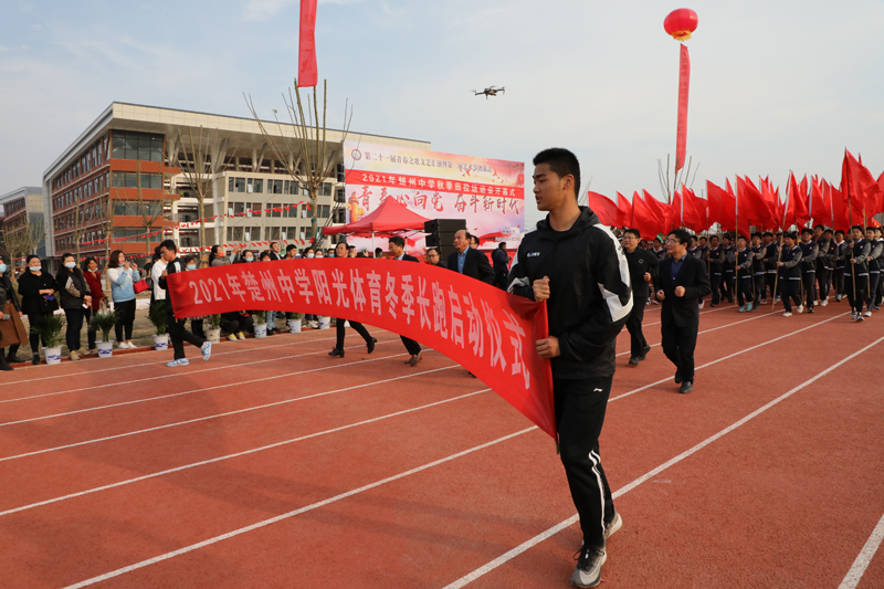 29日下午15:40,楚州中学2021年秋季田径运动会开幕式在学校运动场举行。首先举行了“2021年楚州中学阳光体育冬季长跑启动仪式”暨高一年级花样跑操展示。校长张乃宝率领导班子成员跑在长跑队伍的最前列,跑操队伍步伐整齐划一,口号响亮;一招一式,彰显青春活力;举首投足,尽展律动风彩;充分展现楚中师生团队合作、勇于拼搏、健康向上、自强不息的精神风貌。