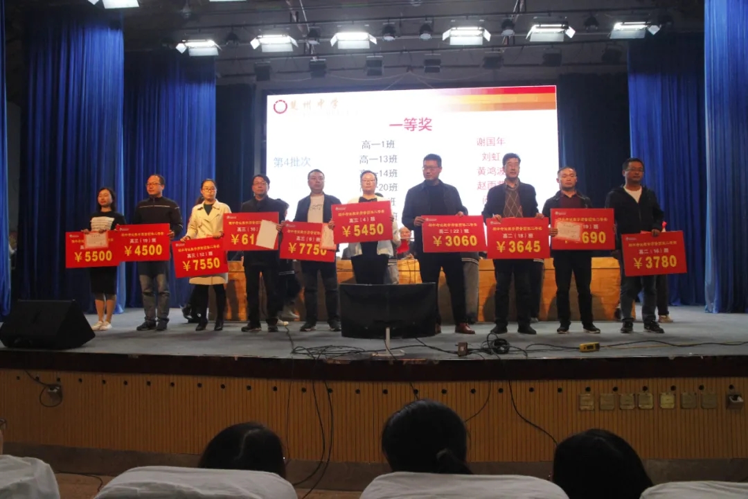 接着,副校长陶月高对本次期中考试成绩进行系统总结。陶校长对各年级、各科成绩的数据进行了详细的分析,让与会老师更加明晰了所教学科的状态。随后,陶校长还宣读了期中考试教学质量成果奖的表彰决定,表彰了获得教学质量团体奖的40个班级(其中一等奖12个、二等奖19个、三等奖9个)以及10个优秀备课组(其中一等奖4个、二等奖6个),143个教学质量个人奖(其中一等奖51人、二等奖49人、三等奖43人)。在热烈的掌声中,受表彰的班主任、教师、备课组长有序上台领奖.