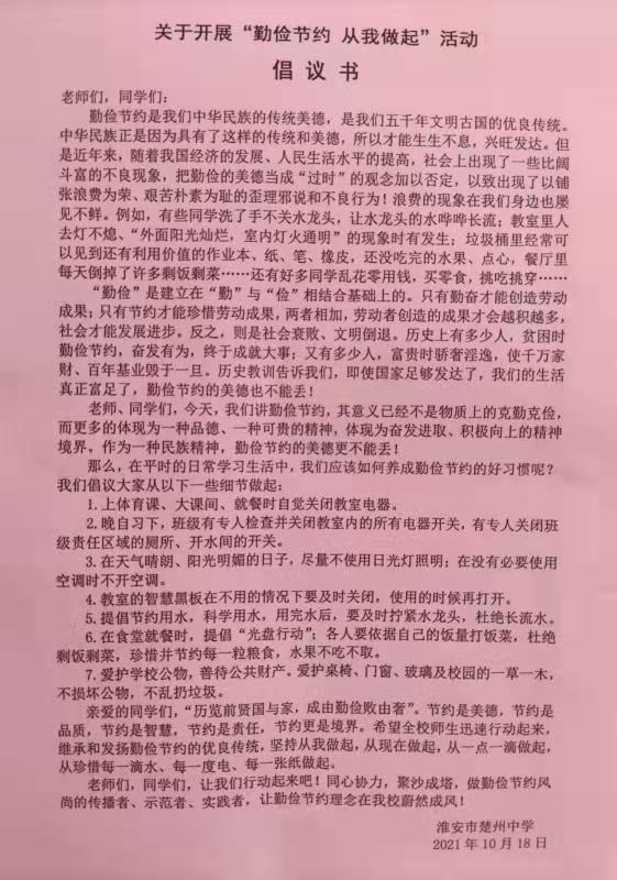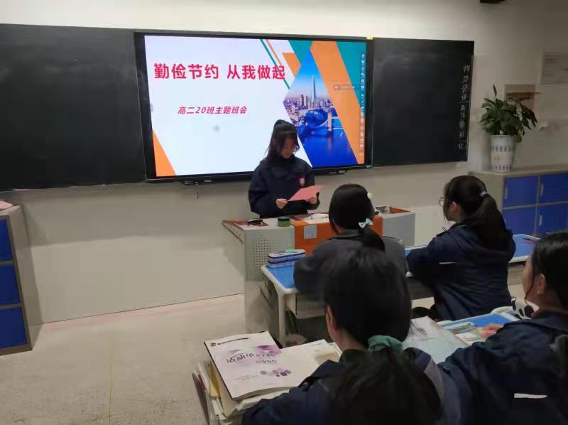 在庄严的升国旗奏国歌仪式后,我校高三(1)班班长、省级优秀学生干部刘浩同学代表班集体向全校师生发出了“勤俭节约从我做起”的活动倡议。在倡议中,他首先告诉同学们,勤俭节约是我们中华民族的传统美德,是我们五千年文明古国的优良传统;然而近年来,社会上却出现了一些比阔斗富的不良现象,把勤俭的美德当成“过时”的观念加以否定,以致出现了以铺张浪费为荣、艰苦朴素为耻的歪理邪说和不良行为。他告诫大家,“勤俭”是建立在“勤”与“俭”相结合基础上的;只有勤奋才能创造劳动成果,只有节约才能珍惜劳动成果,两者相加,劳动者创造的成果才会越积越多,社会才能发展进步;今天,我们讲勤俭节约,其意义已经不是物质上的克勤克俭,而更多的体现为一种品德、一种可贵的精神,体现为奋发进取、积极向上的境界。为此他向全校师生提出了七点倡议:一是上体育课、大课间、就餐时自觉关闭教室电器;二是晚自习下,班级有专人检查并关闭教室内、班级责任区域内的卫生间、开水间的所有电器开关;三是在天气晴朗、阳光明媚的日子,尽量不使用日光灯照明,在没有必要时不开空调;四是教室的智慧黑板在不使用的情况下要及时关闭;五是提倡节约用水,科学用水,用完水后及时拧紧水龙头,杜绝长流水;六是在食堂就餐时,提倡“光盘行动”;七是爱护学校公物,善待公共财产,不乱扔垃圾。他最后说:节约是美德,节约是品质,节约是智慧,节约是责任,节约更是境界。希望全校师生迅速行动起来,继承和发扬勤俭节约的优良传统,坚持从我做起,从现在做起,从一点一滴做起,从珍惜每一滴水、每一度电、每一张纸做起;同心协力,聚沙成塔,做勤俭节约风尚的传播者、示范者、实践者,让勤俭节约理念在学校蔚然成风。活动最后,各班班长代表全班同学举行了宣誓仪式,并在“勤俭节约从我做起”的横幅上庄重承诺签名。