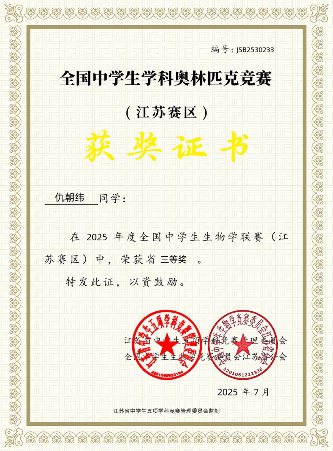 2025年度全国中学生生物学联赛