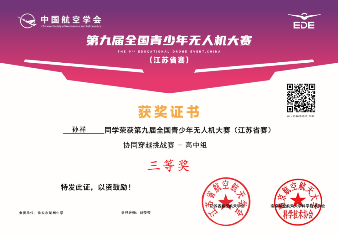 楚中喜报2025(4)|楚州中学27名学生在第九届全国青少年无人机大赛中获佳绩