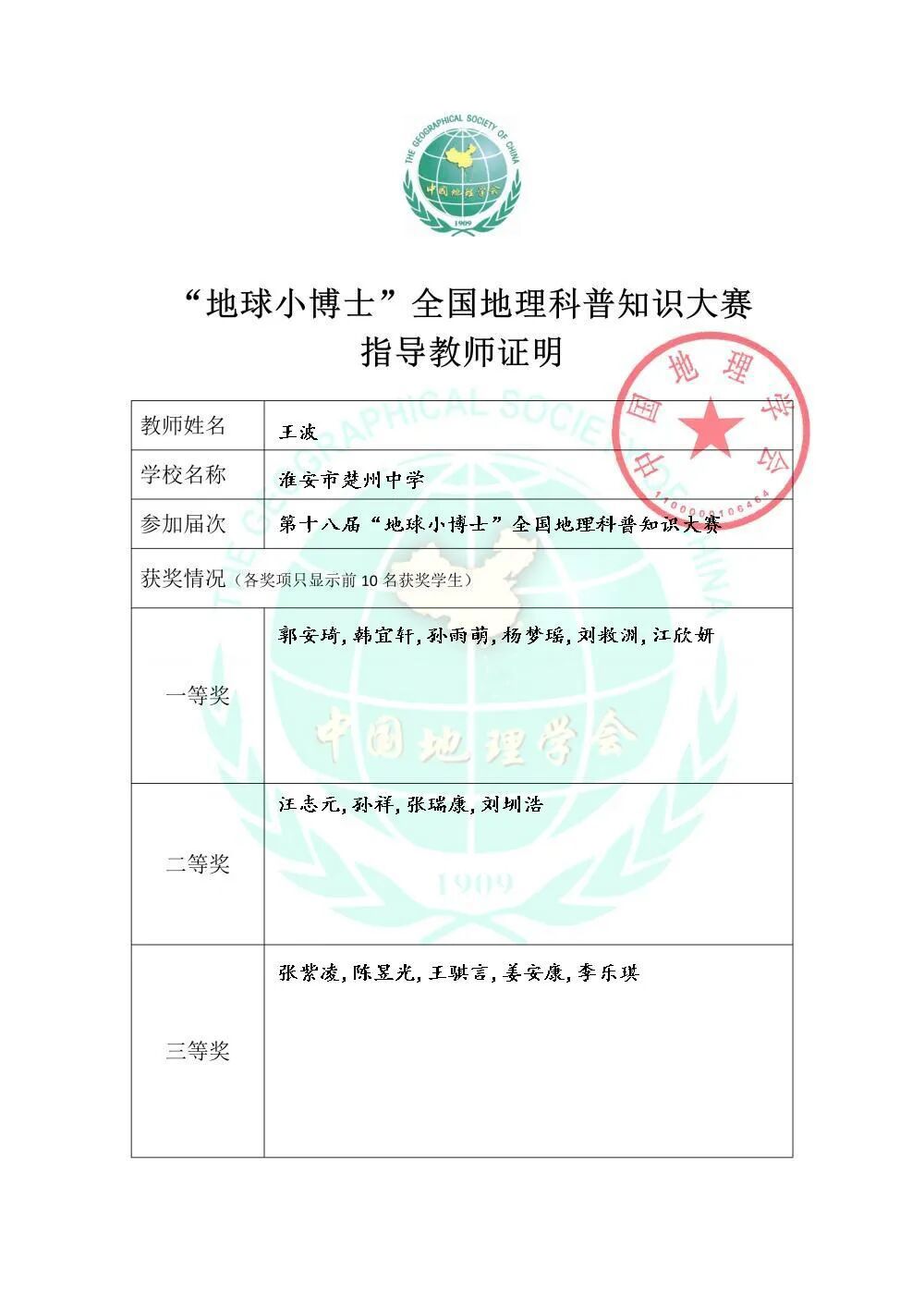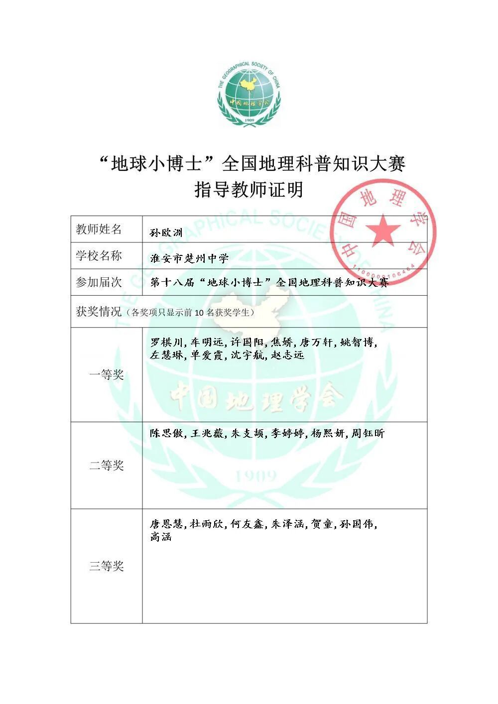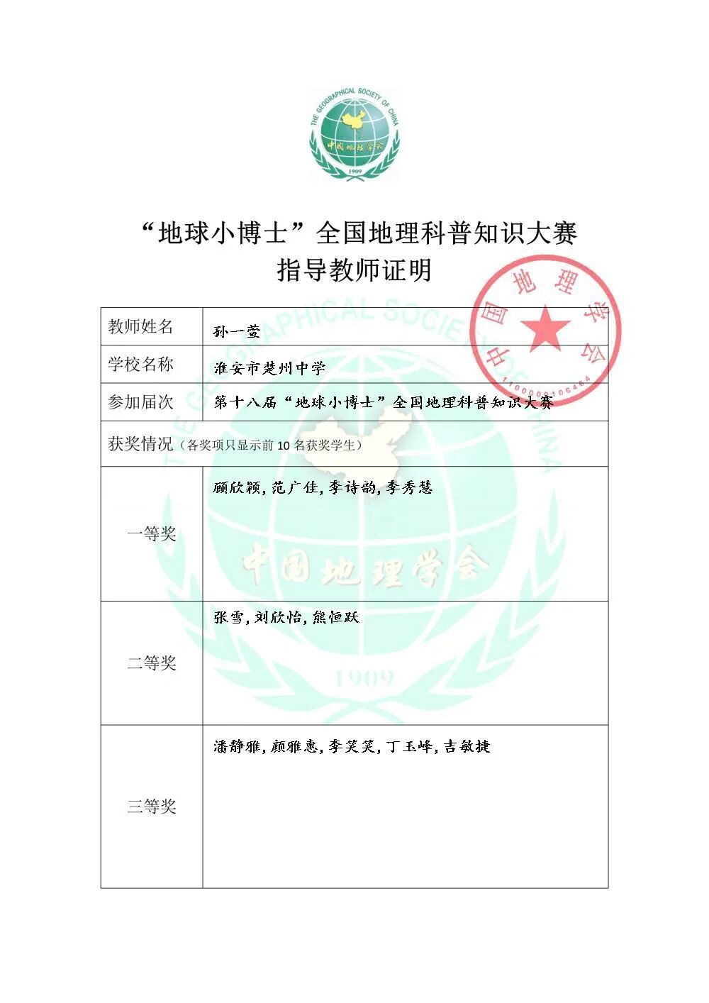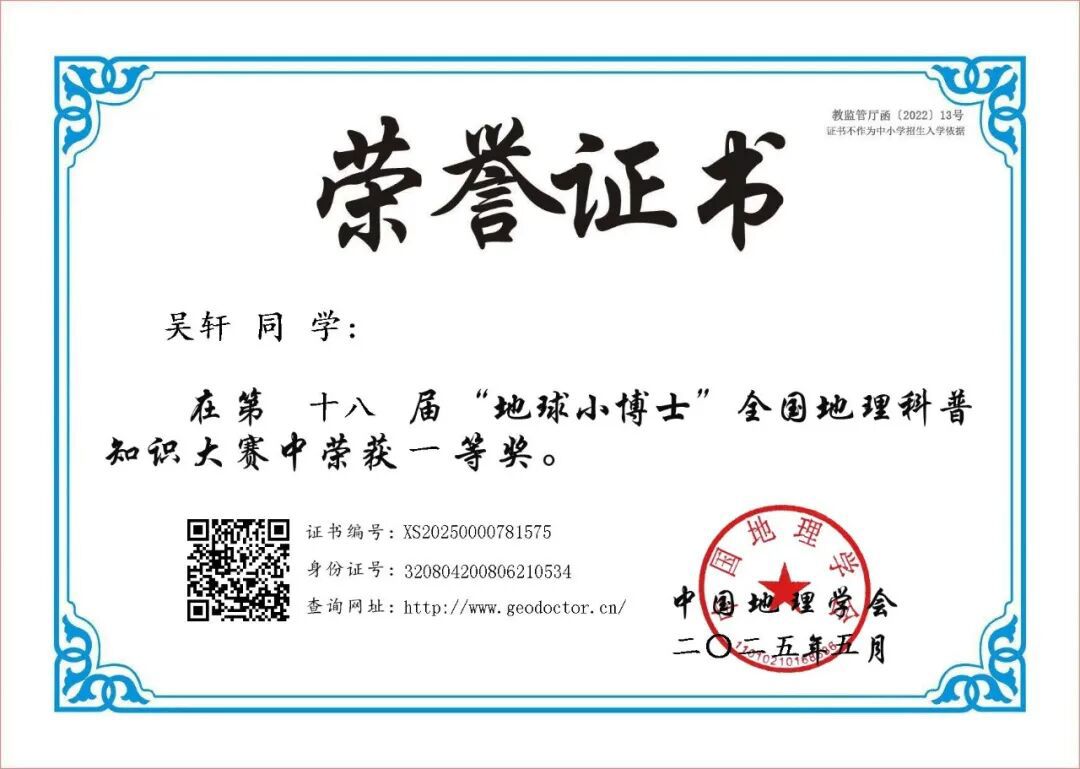 楚中喜报2025(3)|楚州中学26名学生在全国地理科普知识大赛中获一等奖