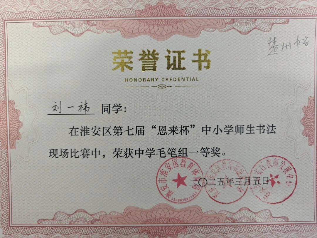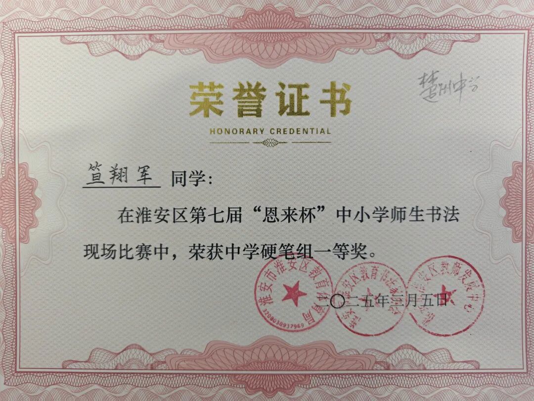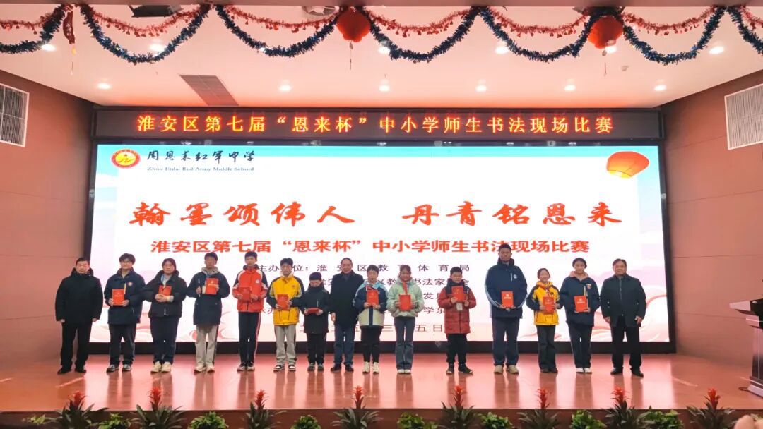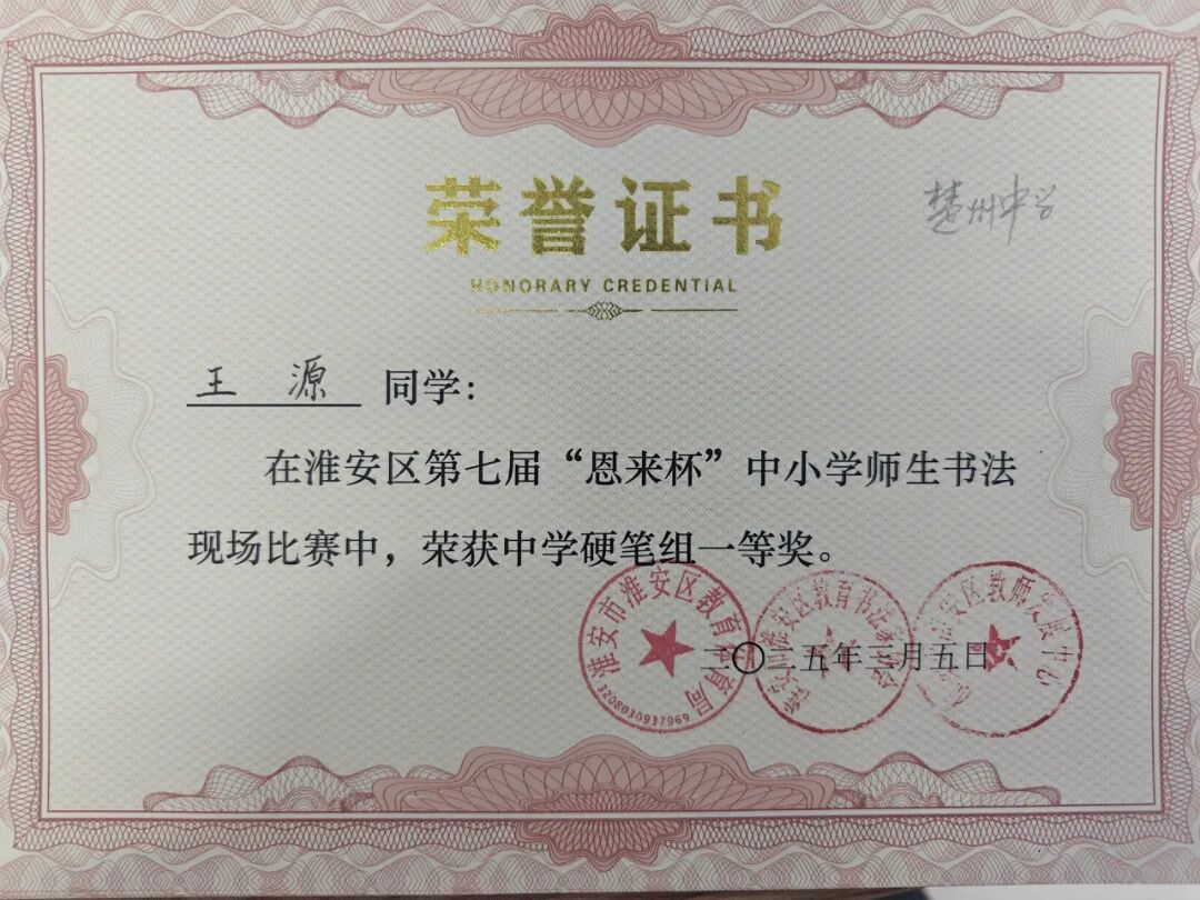 习近平总书记指出:“书法是中华文化的瑰宝,包含着很多精气神的东西,一定要传承和发扬好。”为推动全区教体事业高质量发展,用书法教育成果纪念敬爱的周恩来总理诞辰127周年,淮安区在周恩来红军中学(东校区)开展了第七届“恩来杯”全区中小学师生现场书法比赛活动。比赛现场,参赛选手在规定时间、统一书写用纸上进行现场创作。楚州中学选手沉着冷静、运气凝神、用心书写每一个笔画、每一个汉字,表现出良好的书写习惯。经过紧张激烈的角逐,他们凭借扎实的功底取得了优异的成绩:高二(2)班王源、高二(6)班笪翔军同学荣获中学硬笔组书法一等奖,高一(9)班刘一祎同学荣获中学毛笔组书法一等奖,高二(10)班韩轩瑶荣获中学硬笔组书法二等奖,高一(11)班祁建慧、高二(8)班王雨溪、高一(4)班吴秉政、高三(23)班葛宇琪分获中学参赛组别优胜奖。