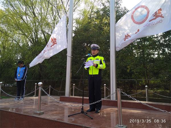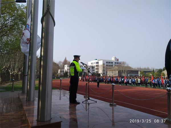 在庄严的升国旗奏国歌仪式后,费志国队长向全校师生作了题为“细节关乎生命,安全文明出行”的主题宣讲。他首先告诉广大师生,文明交通是一个城市精神风貌和文明程度的重要标志,也是一个城市市民素质高低、生活质量好坏的重要标准,告别“不文明交通”的陋习,维护交通秩序,确保交通安全已成为全社会关注的焦点。接着,费队长从身边的典型事故案例、交通安全常识等方面进行了较为详细的讲解。在如何学会保护自己、避免和减少交通事故的发生方面重点要求同学们牢固树立八个意识,即法制意识、防范意识、靠右意识、观察意识、红绿灯意识、斑马线意识、头盔和安全带意识、报警意识,并倡导我校广大师生树立起“文明交通,从我做起,从现在做起”的意识,遵守交规,安全出行,争当文明好市民。