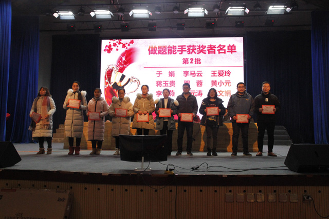 大会最后,各个级部给大家带来了精彩的文艺节目表演。教师们展歌喉,秀舞姿,飙演技,尽展才情,台上台下互动频频。葛大勇老师的脱口秀《婚后那些事儿》动作夸张、语言诙谐、生活气息浓厚,陈雅君、王爱丽、吉立萍等老师集体朗诵《我的淮安,今天壮丽起航》气势磅礴、慷慨激昂、振奋人心,更是将晚会现场的气氛推向了高潮。在联欢会的过程中,还特别安排了抽奖活动,为现场教职工送上了一份份惊喜和一个个衷心祝福,使得会场气氛显得轻松而温馨。
