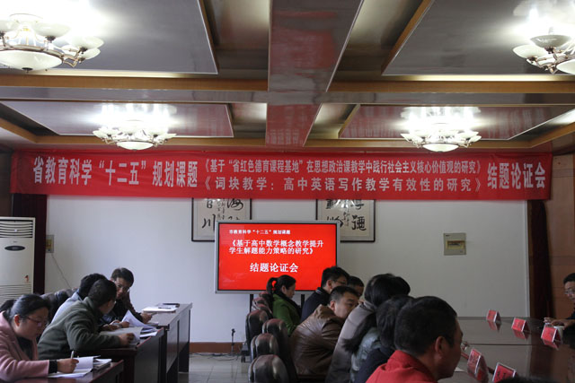 会上,我校一批省市区课题顺利结题。其中,我校武龙宝校长、咸春华主席主持的《基于“省红色德育课程基地”在思想政治课教学中践行社会主义核心价值观的研究》、沙朝文老师主持的《词块教学:高中英语写作教学有效性的研究》省教育科学“十二五”规划课题成功结题。我校老师夏建跃主持的《基于高中数学概念教学提升学生解题能力策略的研究》、徐勤乐主持的《备战政治小高考的“分层推进”策略的实践研究》等多项市、区级课题也顺利结题。