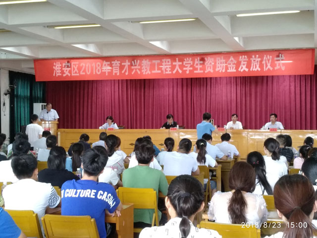 淮安区2018年育才兴教工程大学生资助金发放仪式于8月23日下午3时在淮安区教育局五楼会议室举行,淮安区委书记徐子佳、区政府副区长谈效艳、区人大副主任韩仰超、区政协副主席马世良等四套班子领导,教育局、财政局、民政局、扶贫办等区相关部门负责人,区各高中校校长,100名受助学生代表出席仪式。