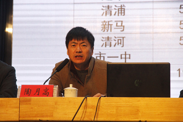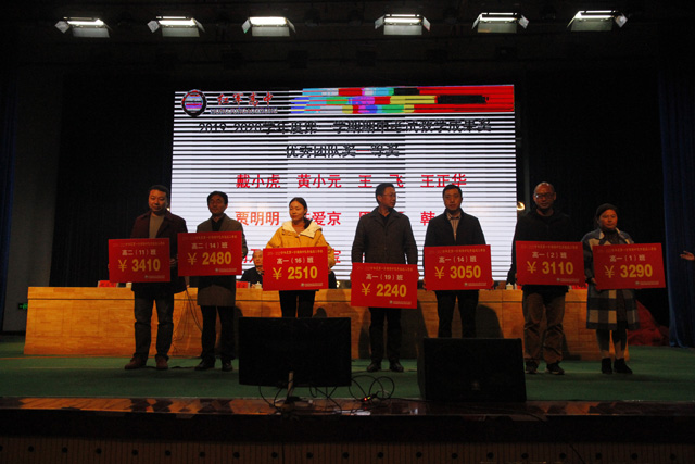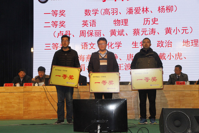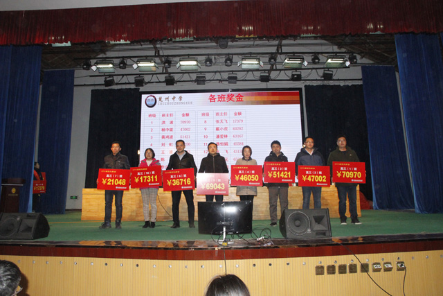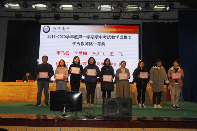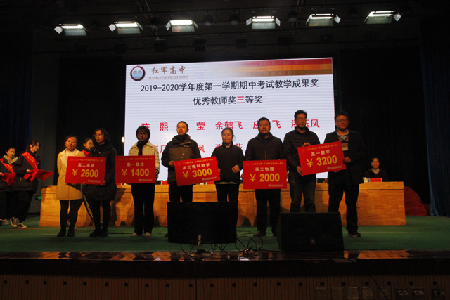 接着,陶月高副校长分析了期中考试成绩,并宣读了期中教学成果奖获奖名单和2019届高三高考奖获奖团队名单。随后,区政府副区长谈效艳携主席台其他领导,一起为42个优秀班级、8个优秀学科、131名优秀教师和2019届高考24个获奖班级颁奖。本次表彰依据教学实绩,注重教学效果,突出勤勉,侧重进步。