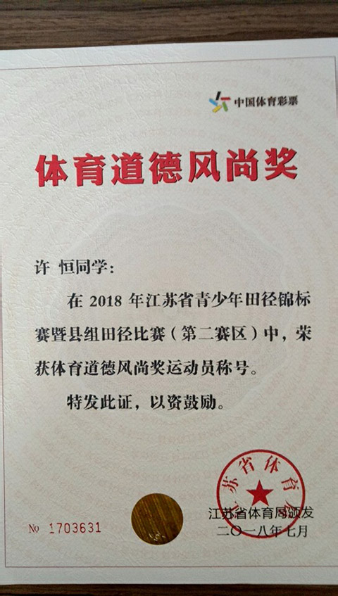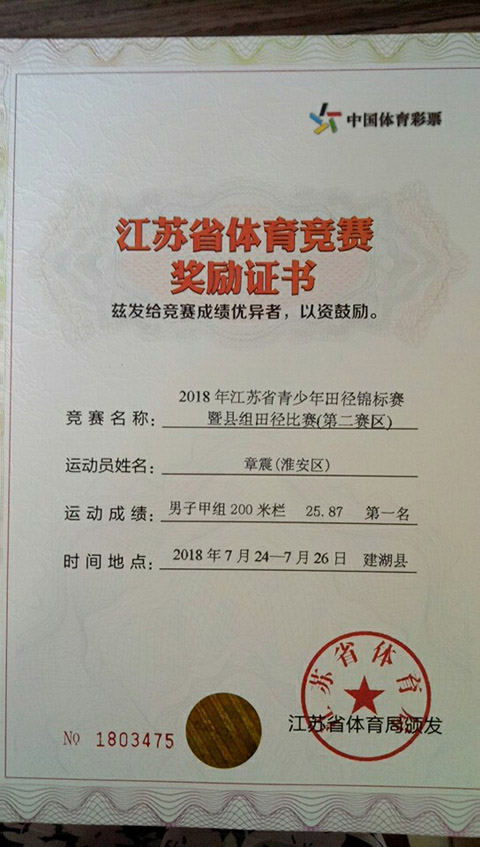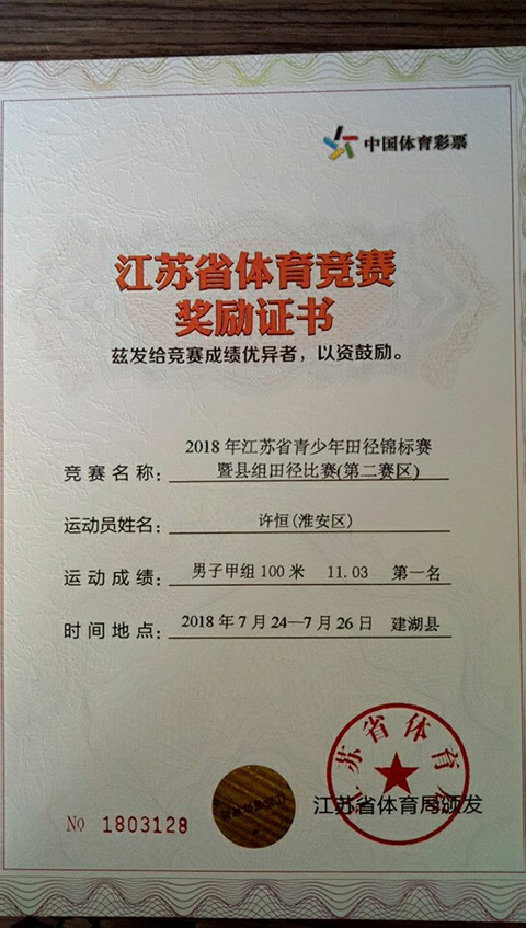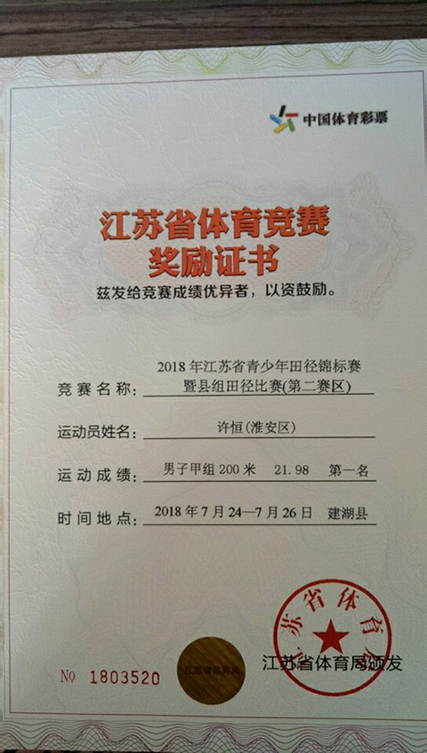 2018年江苏省青少年田径锦标赛已经圆满结束。我校根据区教育局统一部署,选派学生运动员代表淮安区参加本次县组第二赛区比赛。县组第二赛区比赛一共有29个县区参赛,竞争异常激烈。赛前,我校根据比赛规则,结合自身优势,科学制定训练计划,合理分配训练时间,积极探索得分方式,不断弥补自身不足,真正做到准备充分、训练高效。赛场上,我校健儿发扬“更快、更高、更强”的体育精神,赛出了水平、赛出了成绩。经过激烈角逐,我校许恒同学获得男子甲组200米、100米冠军;章震同学获得男子200米栏冠军。我校荣获团体总分第三名,许恒同学还被大赛组委会授予体育道德风尚运动员称号。