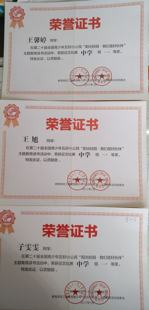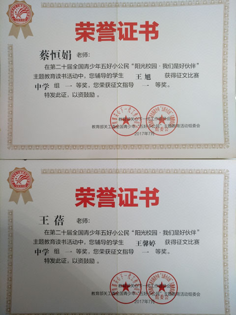 我校刘虹老师被表彰为活动组织工作先进个人,蔡恒娟、王蓓二位老师荣获征文指导一等奖,王波(地理)、黄小元二位老师荣获征文指导二等奖,张洪波、罗磊、张天飞、王正华四位老师荣获征文指导三等奖;王馨婷、王旭、于雯雯三名同学荣获征文比赛中学组一等奖,徐倩、杨金枝、郑蕊三位同学荣获征文比赛中学组二等奖,万如艳、朱雨瑶、李鹏辉三位同学荣获征文比赛中学组三等奖。