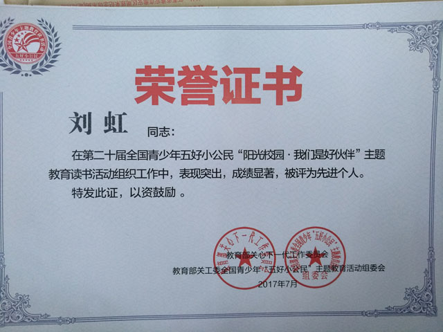 由教育部关心下一代工作委员会主办的第二十届全国青少年五好小公民“阳光校园·我们是好伙伴”主题教育读书活动已于日前揭晓,我校组织师生积极参加这一活动,抓好活动的各个环节,取得了可喜成绩,共有9名教师和9名同学分别获奖。