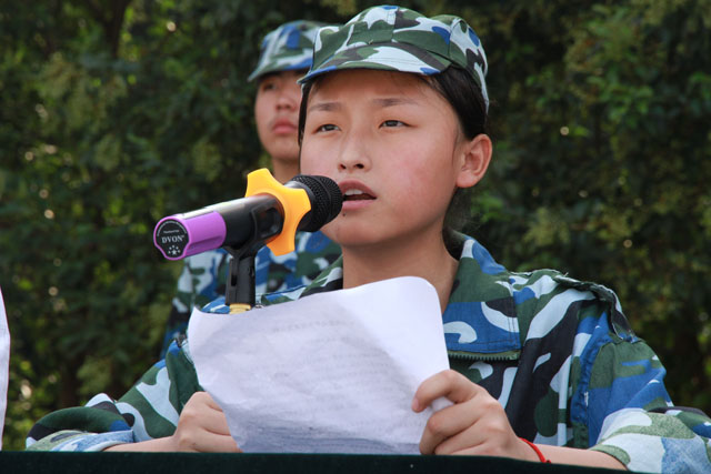 表演结束后,我校武龙宝校长作了军训总结,他代表学校向此次参训的教官和班主任表示了衷心的感谢,向甘冒炎热、刻苦训练、严格自律的同学们表示了亲切的问候,并希望同学们继续发扬军训时拼搏奋进的精神,以崭新的精神风貌,迎接今后的三年高中生活。接着,军训司令部胡虎队长代表部队教官又对全体新生进行了谆谆教导并寄予了厚望。随后,高一(2)班田少彤同学作为学生代表发言。