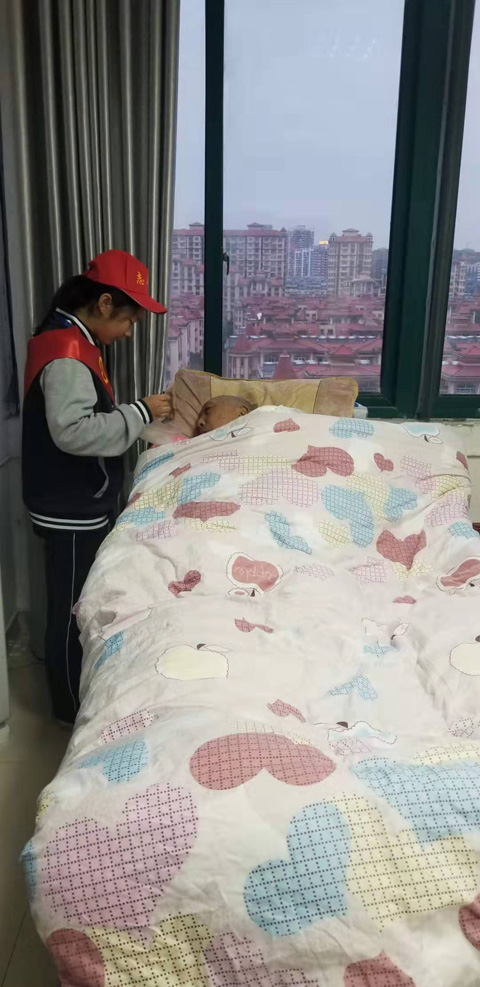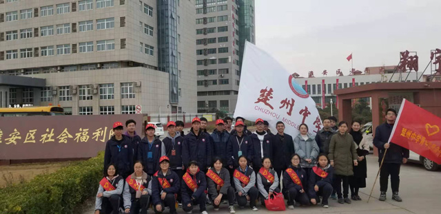 下午4:30,由4名教师、20名学生组成的志愿者队伍,在校团委书记汤飞、副书记高羽的带领下,高举旗帜,步行来到位于梁红玉路1号的翔宇养老中心。在10楼一个个房间里,孩子们向辛劳一辈子的爷爷奶奶们分发了曲奇、脆化饼干,黑布林水果等慰问品。女教师傅国梅、谷玉婷和女同学陈天悦分别为失能老人喂食了晚饭。陈天悦同学特别小心,很有耐心。返程时,她说:仿佛想起了自己小时候父母喂自己的情景。淮安医院退休职工、84岁的刘凤珍接受礼品之后,深表谢意。她一再对孩子们说:“好好学习,多多保暖。我们在这里吃的好,住的好,请大家放心!”高二(14)班张迪同学对笔者说:“这是我第一次到敬老院,向老年人表达爱心,表达敬意,我感到很有意义。我将铭记一辈子。”