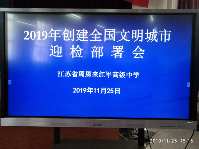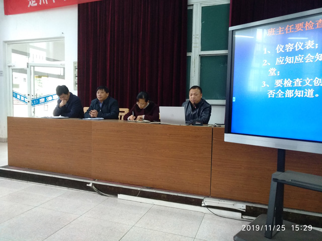 部署会上,陈国强主任对前期迎检工作取得的成就及存在的问题作了总结与分析,并从四个方面对近期迎接全国文明城市测评工作进行了动员部署:一是要教育学生在言行举止上遵守文明礼仪,二是要督促学生掌握创建应知应会知识点,三是要高标准做好校园环境卫生的打扫与保洁,四是要进一步完善文创资料的搜集与整理。他说,创建全国文明城市是提高市民文明素质和城市文明程度的一个重要载体,中学校园理应成为城市精神文明建设中的一张重要名片,全校师生员工要将自己融为城市一分子,要有大局意识、责任意识、主体意识和参与意识,以主人翁姿态积极投身创建活动,为淮安市创建全国文明城市增砖添瓦、多做贡献。
