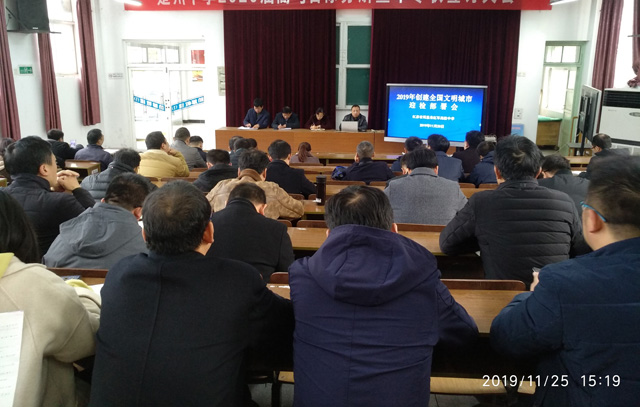 为进一步做好全国文明城市创建工作,完善学校育人机制,日前,我校在南校区文典楼阶梯教室召开了创建全国文明城市迎检工作部署会。副校长赵立同、朱互爱、陶月高,学校校务委员会、文创办全体成员,全体年级组长、班主任及德育处工作人员出席会议,德育处主任陈国强主持会议并作动员讲话。
