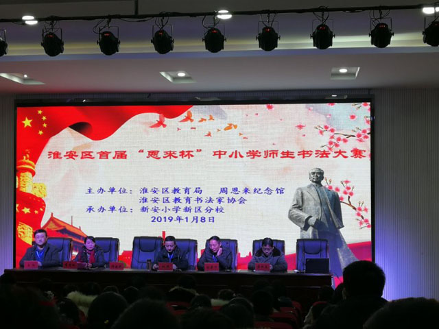 由淮安区教育局和淮安区教育书法家协会联合主办的,淮安区首届“恩来杯”中小学师生现场书法比赛,于1月8日下午在淮安市新安小学新区分校(玖珑湾校区)举行,来自全区中小学、经各校初赛选拔出来的近百名师生选手参加了现场比赛。
