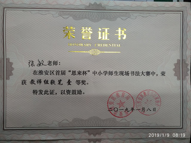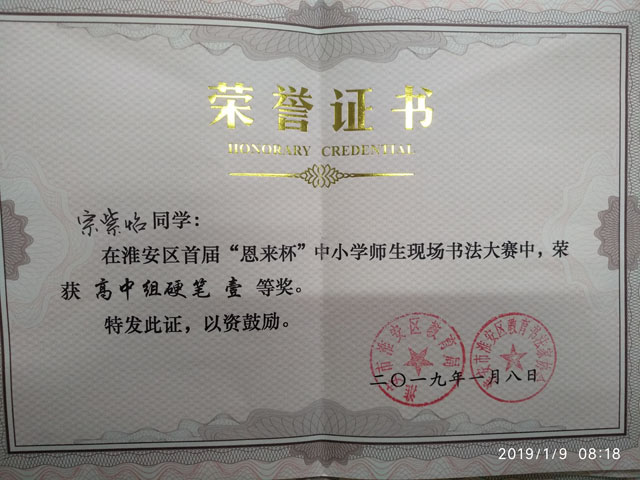 经过紧张激烈的角逐,我校参赛选手凭借扎实的功底取得了优异的成绩:张敏老师获得教师组软笔一等奖;高一(6)班学生李媛、高一(11)班学生宗紫怡获得高中组硬笔一等奖;高一(11)班学生汤馨悦获得高中组硬笔二等奖,另有6名学生获得高中组硬笔三等奖。