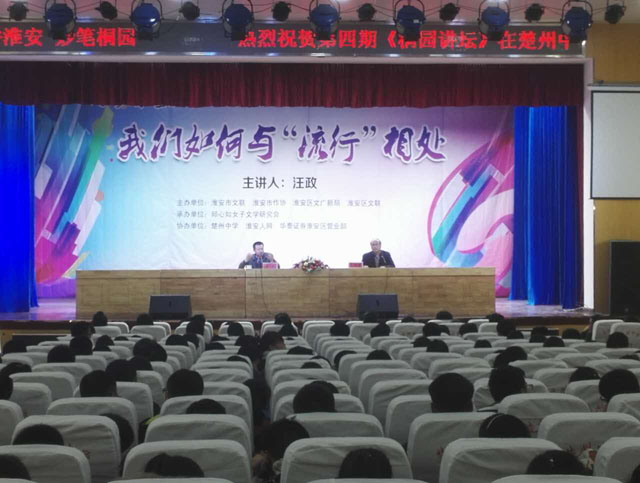 3月26日下午,由淮安市文联、淮安市作协、淮安区文广新局、淮安区文联主办,邱心如女子文学研究会承办,我校等协办的第四期“桐园讲坛”在我校南校区多功能报告厅开讲。本期讲坛邀请了江苏省作家协会党组成员、书记处书记,副主席汪政主讲《我们如何与“流行”相处》,我校部分师生以及区内外一大批文学爱好者聆听了讲座。