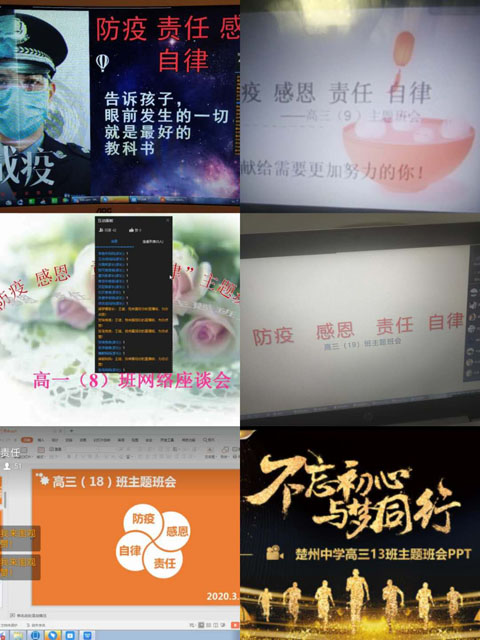 这次线上主题班会活动开展得十分成功。全校三个年级66个班级全部准时召开班会,学校德育处行政干部分别进入各自分包的班级钉钉群参加了班会,还对各班班会课的内容和氛围等进行了评比。班会上,各班主任准备充分,宣讲了目前科学防疫的措施;介绍了我区最美逆行者、省第二批支援湖北医疗队队员、我校教师张文浩爱人孟芹等人的事迹,教育学生更加自律、坚强、刻苦;要求学生规律作息、科学锻炼。学生及家长代表表达了对一线医护人员的崇敬之情,汇报了近期居家线上学习的情况和防疫措施。有的班级以抗疫防疫为重点,融合了爱国主义教育、社会主义核心价值观教育、生命教育和心理健康教育等内容,从而加强了特殊时期班主任对学生的教育和引导,增强班集体的向心力和凝聚力;有的班级组织学生分享时事新闻资料,运用丰富的图文和视频与同学们进行互动交流,引导学生深刻认识作为社会人,每个角色都有自己的责任和使命;有的班级带领学生总结防疫知识和小妙招,探究疫情中的“谜团”,展示特殊时期的学习生活,赞颂身边的战“疫”人物,引导学生与祖国同呼吸、共命运,坚定了同学们战胜疫情的信心;有的班级通过钟南山院士为代表的奋斗在抗疫一线工作者们的事迹,告诉同学们什么是责任和担当,作为当代中学生当前的责任和担当就是要在做好自身防疫的同时,认真学习线上课程,做到停课不停学;有的班级进行了“致逆行者诗朗诵”,坚定地表达了作为新生力量接过接力棒、逆流而上的责任担当;有的班级进行了网上宣誓活动,表示要从自我做起、从今天做起、从早起晨读到听好每一节网课做起,对自己负责,对所有关爱自己的人负责……参会的各分包领导对同学们在线刻苦学习的表现表示赞赏和鼓励,并对学生和家长再次强调了“疫情就是命令、防控就是责任”,教育学生要明确目前自己的责任,学习逆行者们为国家为人民的担当意识、责任意识和自律意识。