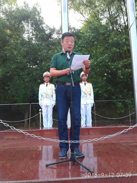 在飘扬的五星红旗下,楚州中学副校长朱锦富向全体师生作了题为“让我们与文明同行”的讲话。他说,文明是我们炎黄子孙综合素质的重要体现,没有了文明,就如齿唇之寒,素质就得不到保证,就无法成为一名合格的中学生,更别说担当起国家的建设者和接班人的重任了。他通过两则生动的反面小故事来说明缺乏文明的言行所带来的危害。他还列举了身边一系列不文明的行为现象强调我们中学生首先应该做一个堂堂正正的人,一个懂文明、有礼貌的谦谦君子,然后才是成才。他希望全体同学要做中国的文明礼仪大使,继承中华民族的优良传统,为赢得世界人民的尊敬,从自我做起,从小事做起,争当文明学生,为我市创建“全国文明城市”贡献出自己一份应尽的力量。