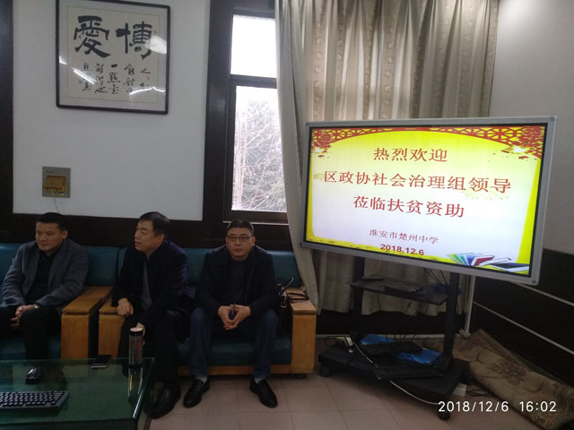 12月6日下午四时许,我校丽正楼二楼会议室内暖意融融,淮安区政协委员、区委政法委副书记、区综治办主任胡彦携区政协社会治理组部分委员代表一行七人莅临我校,为10名贫困学子送温暖、献爱心。