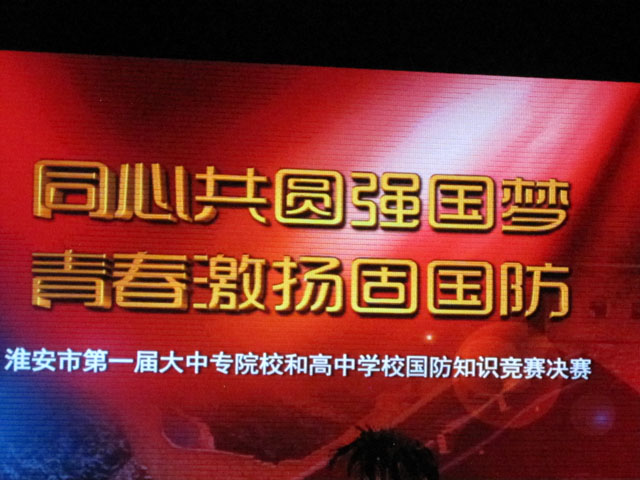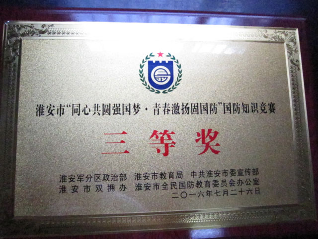 7月26日下午,由淮安军分区政治部、市委宣传部、市教育局、市双拥办、市全国国防教育办公室联合举办,以“同心共圆强国梦、青春激扬固国防”为主题的淮安市第一届大中专院校和高中学校国防知识竞赛决赛在市电视台演播大厅举行。我校由朱爱军老师领队,王梦、安琪、汪文涛3名同学组成的代表队以预赛第一的优异成绩参加了决赛,并荣获市三等奖。