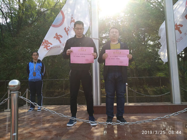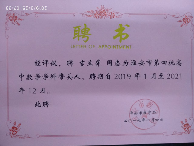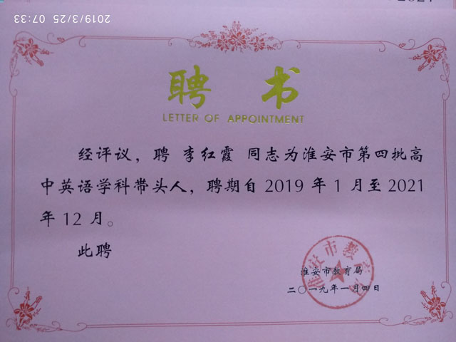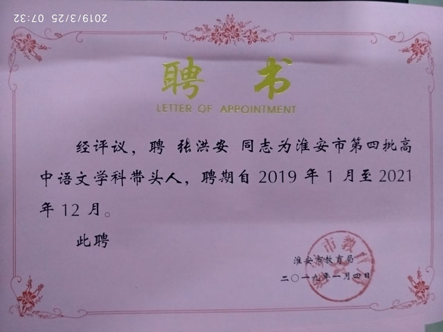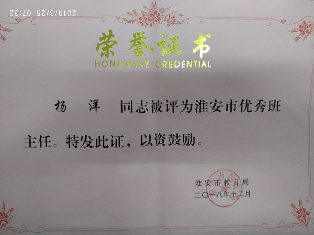 为了表彰先进,弘扬正气,进一步发挥先进典型的模范带动和示范引领作用,激发正能量,3月25日上午,我校在运动场举行仪式,为两名受表彰的市优秀班主任和五名受聘的市学科带头人颁奖,校长张乃宝亲自为他们颁发了淮安市教育局颁发的荣誉证书和聘书。