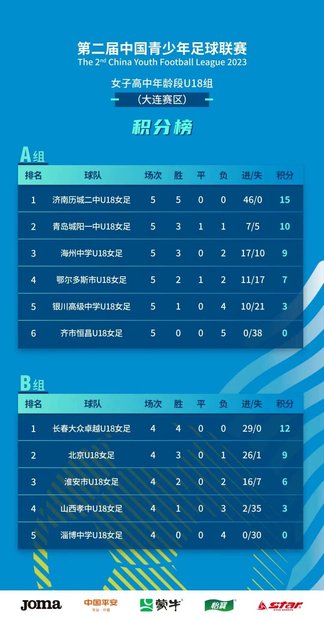 4月25日,2023第二届中国青少年足球联赛女子高中年龄段U18组第一阶段比赛在辽宁大连和贵州都匀战罢。